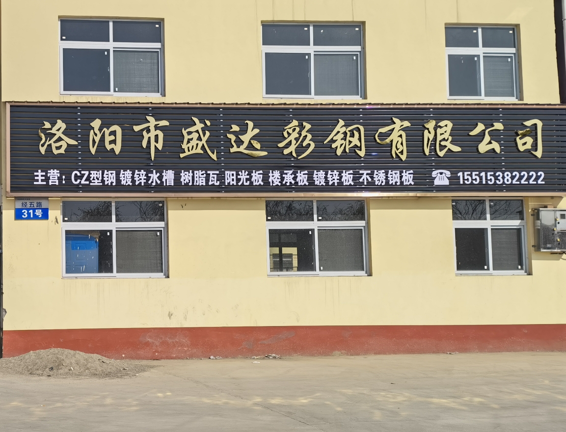 • 洛陽市盛達彩鋼有限公司主要從事經營: 12米剪版折彎鍍鋅水槽天鉤, 彩涂板、鍍鋅板、彩鋼復合板、覆膜彩鋼瓦、彩鋼瓦 C型鋼 鍍鋅新型鋼結構的設計、加工、安裝 。產品主要用于大、中、小型廠房、樓房加層、超市、倉庫、汽車展廳、活動房、農貿市場等工程。